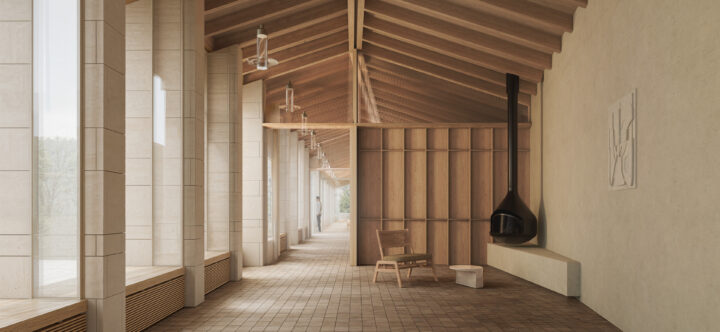 Fourth, a pitched wooden roof generates high, continuous interior volumes while responding to regulatory constraints. The ridge emphasises the building’s longitudinal axis, defining a 60-metre zone along the western boundary that functions as an extended circulation and seating area. At the same time, the northern side accommodates the more programmatically assigned spaces. Skylights regulate daylight and ventilation, improving comfort and reducing energy demand and the building’s carbon footprint.